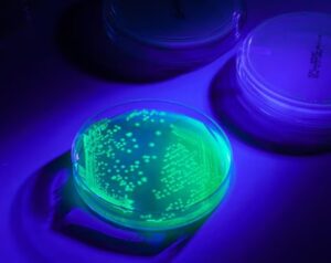 UV-BioTAG micro-organisms contain a green fluorescent protein (GFP) marker that is visible under UV light. This makes it easy to differentiate these control strains from contaminants.